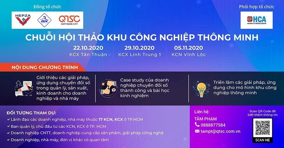 Với mong muốn xúc tiến đầu tư ngành công nghệ thông tin, kết nối và giúp các doanh nghiệp hoạt động trong KCN, KCX có cơ hội tìm hiểu, ứng dụng các công nghệ nhằm cải tiến hoạt động quản lý, sản xuất kinh doanh, định hướng phát triển theo hình mẫu KCN/KCX thông minh, Ban quản lý các khu chế xuất & công nghiệp TP.HCM (Hepza) và Công viên phần mềm Quang Trung (QTSC) và Trung tâm Xúc tiến Thương mại và Đầu tư TP.HCM (ITPC) phối hợp cùng Hội tin học TP.HCM (HCA) tổ chức Chuỗi Hội thảo Khu công nghiệp thông minh.