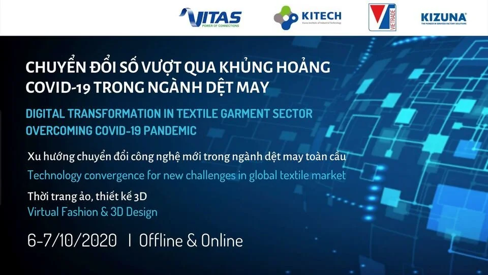 Hiệp hội Dệt May Việt Nam (VITAS) và Viện Công nghệ Công nghiệp Hàn Quốc (KITECH) xin gửi tới Quý Công ty lời chào trân trọng và lời mời tới tham dự, chia sẻ tại Hội thảo Chuyển đổi số vượt qua khủng hoảng Covid-19 trong ngành dệt may thời trang. Đây là Hội thảo thường niên nổi bật do VITAS và KITECH phối hợp tổ chức từ năm 2015 để giới thiệu các giải pháp kỹ thuật tiên tiến, chia sẻ kiến thức và tăng cường hợp tác trong ngành dệt may giữa Việt Nam và Hàn Quốc. Do ảnh hưởng của Covid-19, series hội thảo năm nay sẽ được tổ chức trong hai tháng 10, 11/2020 kết hợp cả mô hình trực tiếp và online, với nội dung trọng tâm là chia sẻ các giải pháp giúp DN vượt qua khủng hoảng.