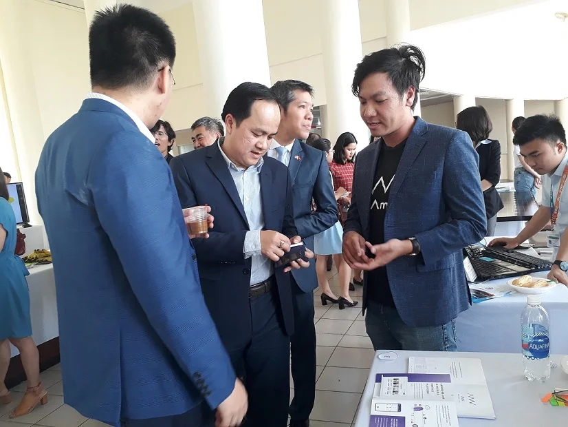 Lê Hoàng Nhật, CEO Ami (phải) trong một buổi giới thiệu sản phẩm công nghệ của doanh nghiệp mình tại chương trình Hội thảo về Khu đô thị sáng tạo phía đông TP.HCM tổ chức tại ĐH Quốc gia TP.HCM.