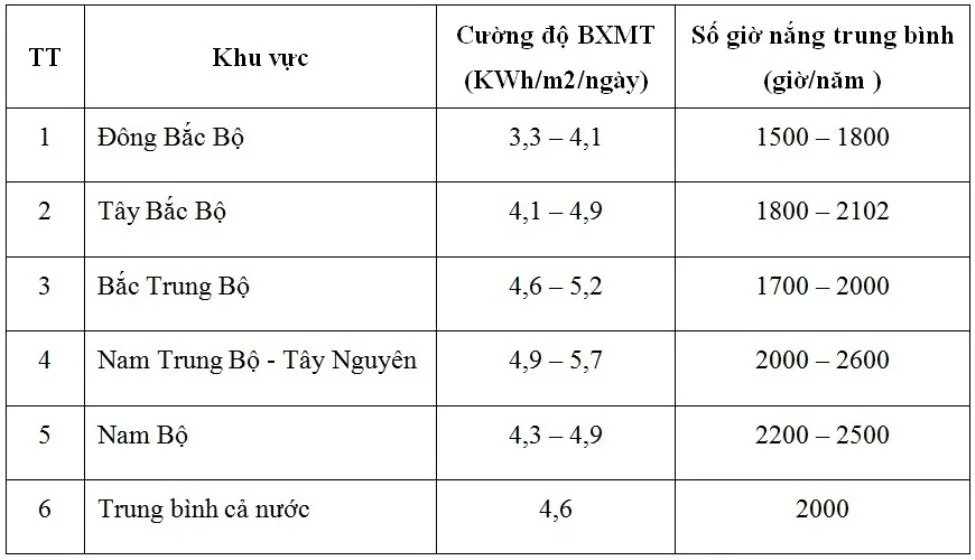 Bảng Giá trị trung bình cường độ bức xạ ngày trong năm và số giờ nắng của một số khu vực khác nhau ở Việt Nam.