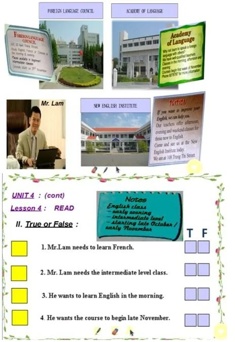 Ví dụ: English 9 - Unit 4 - Read - trang 36: Giáo viên giúp học sinh định hình sẽ học gì bằng cách dùng tranh giới thiệu tình huống để dẫn dắt vào bài học là ông Lâm đang đọc ba quảng cáo về ba trường ngoại ngữ. Ông ấy có nhu cầu học một lớp ngoại ngữ. Hãy cùng tìm hiểu xem ông ấy muốn học ngoại ngữ nào, trình độ nào, thời gian nào…