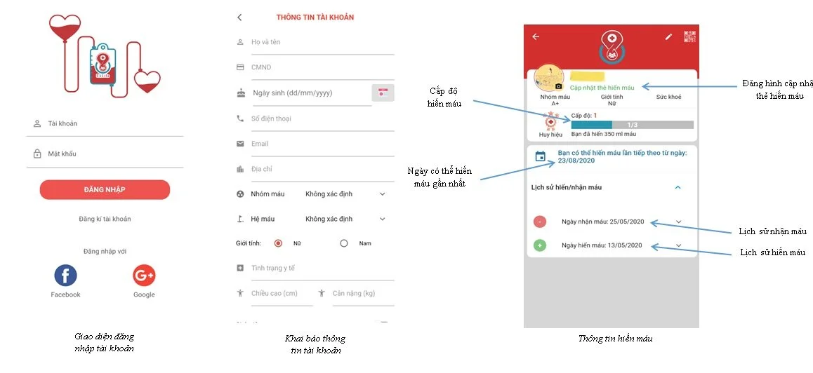 Người dùng đăng nhập, đăng ký để khai báo thông tin cá nhân, lịch sử hiến máu, lịch hẹn hiến máu, thời gian được phép hiến gần nhất.