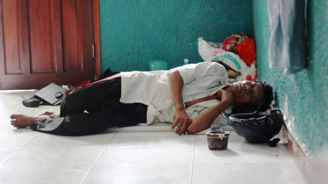 Lên phòng, hình ảnh đập vào mắt tôi là cảnh ba người đàn ông đang say giấc. Ánh sáng mặt trời hiếm hoi từ mấy lỗ cửa sổ rọi thẳng vào căn phòng có diện tích khoảng 6 m2, gối và mền bốc mùi hôi nồng nặc.