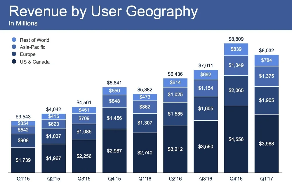Để dễ dàng so sánh những khó khăn của Facebook, đây là biểu đồ doanh thu tại các khu vực trên thế giới qua từng quý.