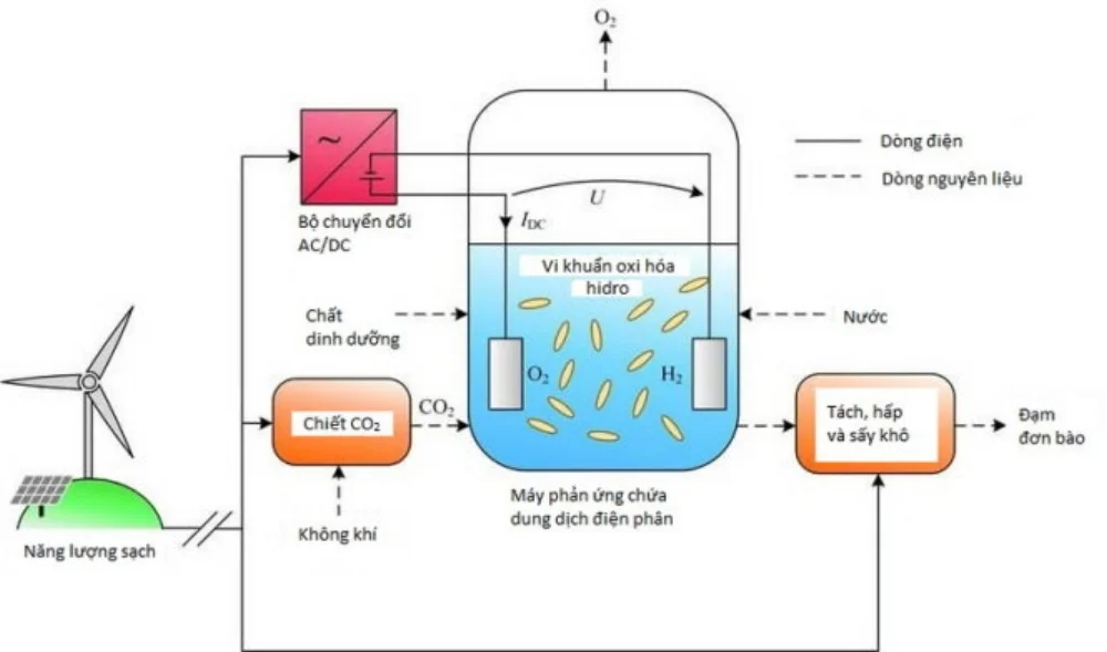Sau khi cho nguyên liệu thô vào dung dịch điện phân trong máy phản ứng sinh học, các nhà khoa học thu được một hợp chất dạng bột chứa 50% đạm và 25% tinh bột. Việc thay đổi loại khuẩn sẽ thay đổi trạng thái của nó.