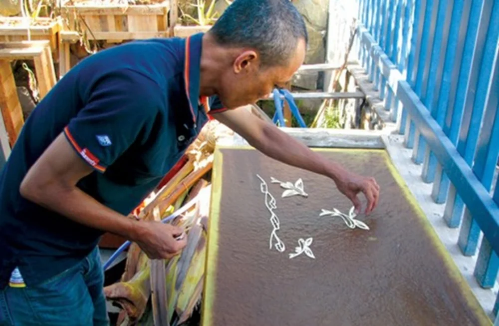 Vậy là quy trình hoàn chỉnh: xơ dừa nấu bằng nước vôi trong, xay thành bột. Một khung gỗ với màn hình bằng voan có rải hỗn hợp bột, trên đó xếp các hình cắt hoa văn, tạo áp lực nước lên, sau đó gỡ bỏ hình cắt, đem khung sấy khô dưới ánh nắng mặt trời vài ngày sẽ cho ra mảnh giấy mà hoa văn được dập nổi lên trên.