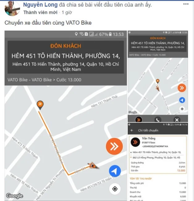 Tài xế VATO tại TP.HCM khoe cuốc chạy đầu tiên. Ảnh chụp màn hình.