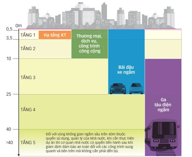 Phân tầng các lớp không gian xây dựng ngầm đô thị - Đồ họa: TẤN ĐẠT