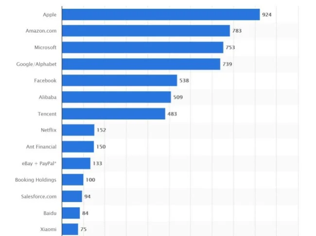Bảng xếp hạng những công ty có vốn hoá lớn nhất trên toàn Thế giới tính đến tháng 5, 2018. GAFA chiếm vị trí thứ 1, 2, 4, 5. BATX chiếm vị trí 6, 7, 13, 14 (Đơn vị: Tỷ USD) - Theo statista.com