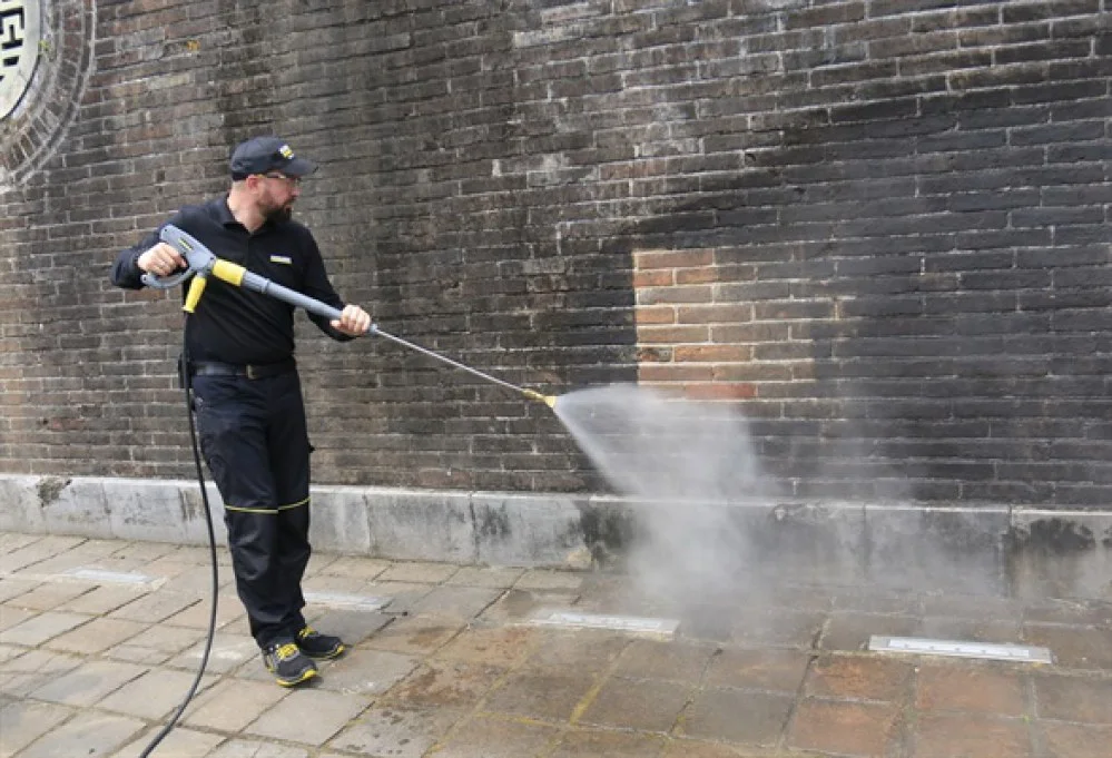 Với đầu phun đặc biệt để tăng áp và tạo ra luồng hơi nước nóng, chuyên gia của Đức đã làm sạch nhanh chóng các bề mặt gạch có bám rêu tại Cổng Ngọ Môn - Di sản thế giới UNESCO tại Huế.
