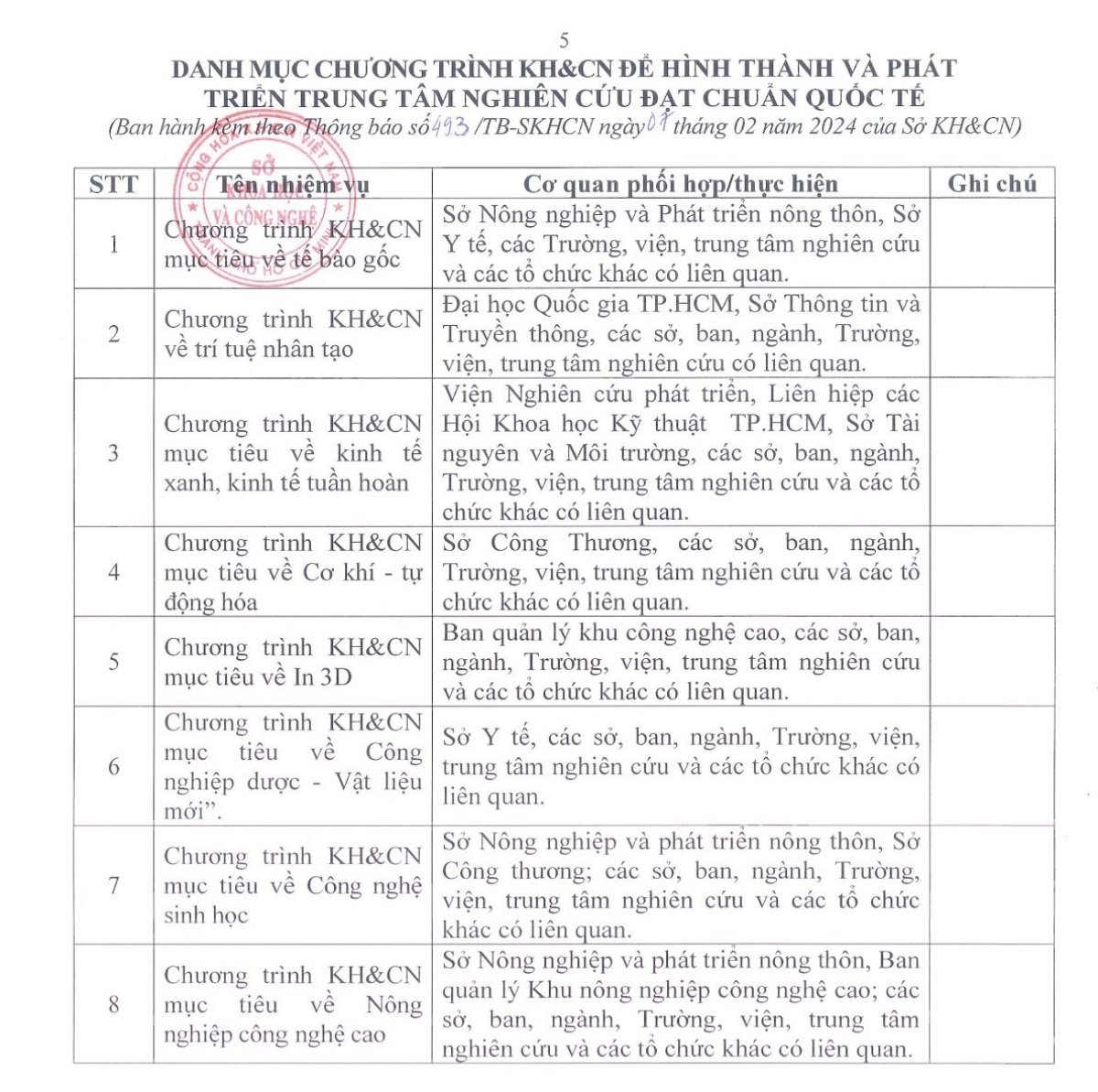 Ngày 07/02/2024 vừa qua, Sở Khoa học và Công nghệ TP.HCM đã ban hành thông báo mời các tổ chức tham gia đăng ký thực hiện các nhiệm vụ khoa học và công nghệ để hình thành và phát triển trung tâm nghiên cứu đạt chuẩn quốc tế, kèm danh mục 8 chương trình nghiên cứu với mục tiêu cụ thể gồm: Tế bào gốc; Trí tuệ nhân tạo; Kinh tế xanh, Kinh tế tuần hoàn; Cơ khí - tự động hóa; In 3D; Công nghiệp dược - Vật liệu mới; Công nghệ sinh học; Nông nghiệp công nghệ cao. Theo thông báo (xem chi tiết tại đây), đối tượng tham gia được áp dụng là tổ chức khoa học và công nghệ công lập do Ủy ban nhân dân Thành phố thành lập và tổ chức khoa học và công nghệ công lập khác trên địa bàn Thành phố.